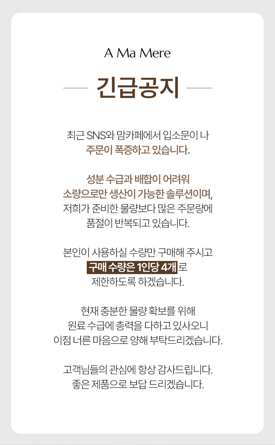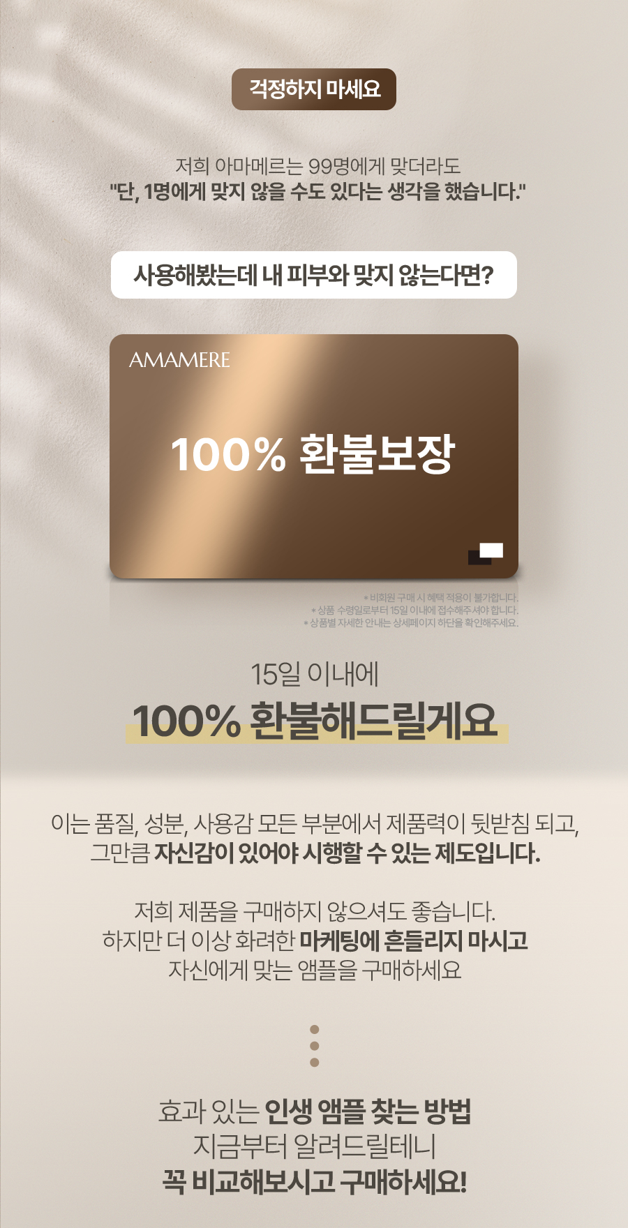 | ์๋ง๋ฉ๋ฅด๋ ๋น์ ์ ํผ๋ถ ๊ณ ๋ฏผ์ ์ํ ๋จ ํ๋์ ํด๋ต์ ํจ๊ป ์ฐพ์๊ฐ๋๋ค. ์ฌ์ฉ ํ ๋ง์์ ๋ค์ง ์์ผ์ จ๋ค๋ฉด, 15์ผ ์ด๋ด 100% ํ๋ถํด๋๋ฆฝ๋๋ค. ์๋ ๋ด์ฉ์ ๊ผญ ํ์ธํด์ฃผ์ธ์. 1. ์๋ง๋ฉ๋ฅด ๊ณต์ ํํ์ด์ง ํ์ ํํ์ผ๋ก ๊ณต์๋ชฐ(www.amamere.co.kr)์์ ๊ตฌ๋งคํ ๊ฒฝ์ฐ์๋ง ์ ์ฉ๋ฉ๋๋ค. (โป ๋นํ์ ๊ตฌ๋งค ์์๋ ์ ์ฉ๋์ง ์์ต๋๋ค.) 2. ์ํ ์๋ น์ผ๋ก๋ถํฐ 15์ผ ์ด๋ด ๊ณ ๊ฐ์ผํฐ๋ก ์ ์ํด์ฃผ์ ์ผ ํฉ๋๋ค. 3. ๊ตฌ๋งคํ์ ์ ํ ์ ์ฒด๋ฅผ ๋ฐํํด์ฃผ์ ์ผ ํ๋ถ์ด ๊ฐ๋ฅํฉ๋๋ค. (โป ๋ถ๋ถ ๋ฐํ ์, ์ฌ์ฉ๋ ์ ํ์ ์ ์๊ฐ ๊ธฐ์ค์ผ๋ก ์ฐจ๊ฐ ํ ํ๋ถ๋ฉ๋๋ค.) 4. ๋ฐํ๋น์ฉ 7,000์์ ๊ณ ๊ฐ ๋ถ๋ด์ด๋ฉฐ, ํ๋ถ ๊ธ์ก์์ ์ฐจ๊ฐ๋ฉ๋๋ค. |